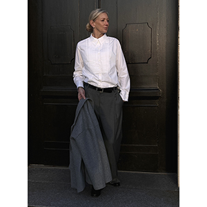 Der Designerleftover Silvermoon – eine feine Schurwoll-Viskose-Mischung – ist wie gemacht für die Bundfaltenhose Loverdayle von Frau Marzi. Mit seinem schönen Fall und der ruhigen, eleganten Oberfläche wird er schnell zum Lieblingsstück (der gleiche Stoff in Dark Navy hat schon meine Frau Orla von studioschnittreif zur Lieblingshose gemacht). Für die Bluse Longforten von Frau Marzi haben wir auf den perfekten Stoff gewartet: Der Designerleftover Papertouch in Weiß hat die perfekte, leicht feste Struktur – ideal auch für den Patternhack mit Biesen. (Auch in Navy und Schwarz erhältlich.) Ein stimmiges, schlichtes Outfit mit besonderen Stoffen – hochwertig im Look und angenehm zu tragen. Alle Stoffe findet ihr bei den Designerleftovern im Shop.