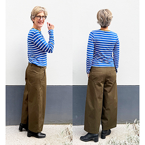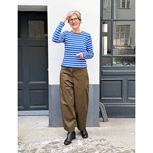 Die Hose könnt ihr aus Baumwolltwill mit unserem „Shop the Look“-Paket nachnähen. Ich freue mich jetzt schon auf meine nächste Version – aus Denim oder sogar aus edler Anzugwolle? Oder beides? Vielleicht erinnert ihr euch noch an meine erste smartPattern Barrel Leg Jeans? Sie ist nach wie vor eine echte Lieblingshose. Deshalb haben wir jetzt auch ein neues Nähpaket zur Barrel Leg HJ09 in den Shop gestellt. Übrigens: Das Shirt zur Hose ist Frau Yelda von Studio Schnittreif. Das Nähpaket aus dem gestreiften Viskosejersey gibt es HIER im Shop!