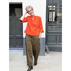 In dieser Version meines Centrefolds habe ich mich für Farbe entschieden! Der Stoff ist ein Designerleftover aus Baumwolle mit Seidenanteil in Rotorange – dadurch entsteht eine unglaublich schöne Oberfläche. Colorblocking auf die dezente Art: Denn diesen Stoff haben wir auch noch in der Farbe Moccha Mousse vorrätig, mit der ich die Ärmelschlitze gefüttert habe.