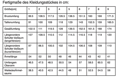 Um für dich die richtige Größe (1-9) zu finden, messe erst deinen Brustumfang. Dann addiere ca. 15 – 20cm hinzu, je nachdem, wie weit du deinen Mantel nähen möchtest. Anhand dieses Maßes, kannst du in der Tabelle deine Größe finden.  Passe deinen Schnitt im Gesäßbereich an, wenn nötig.